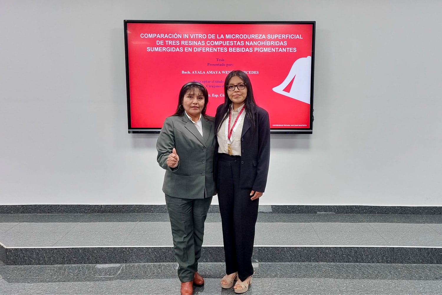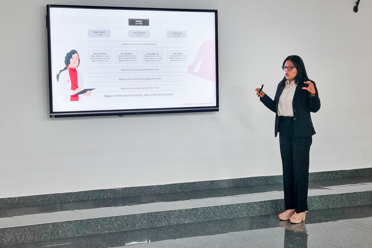 La Bachiller Wendy Mercedes Ayala Amaya presentó su tesis. El tema central fue la microdureza superficial de resinas compuestas. Comparó su comportamiento en diferentes bebidas pigmentantes. Esta investigación es vital para la práctica clínica. Aporta conocimiento útil a la odontología moderna.