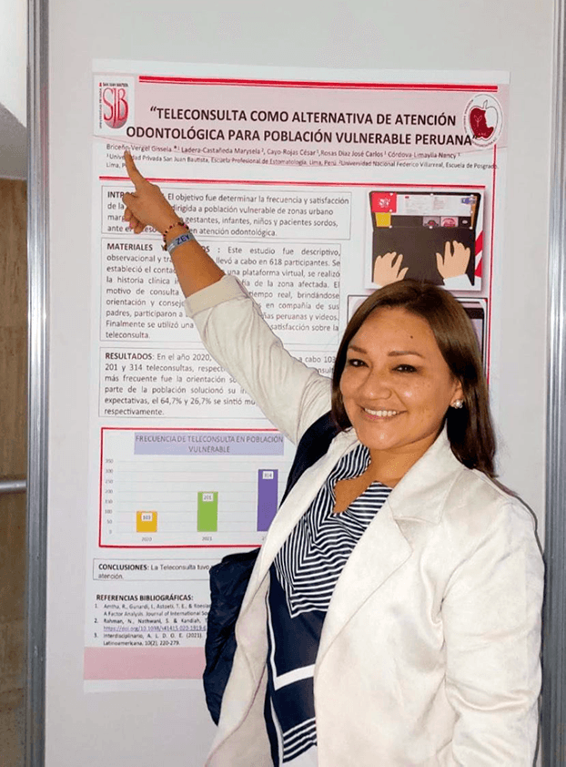 Nuestra docente y especialista en odontopediatría, Mg. Gissela Briceño Vergel, participó en el XXI Congreso Internacional de la Academia Mexicana de Odontopediatría, con la presentación de un póster titulado: “La teleconsulta como alternativa en atención odontológica en población vulnerable peruana”. El trabajo fue realizado de manera conjunta con el equipo de Investigación y Responsabilidad Social de la Escuela Profesional de Estomatología de la Universidad Privada San Juan Bautista.