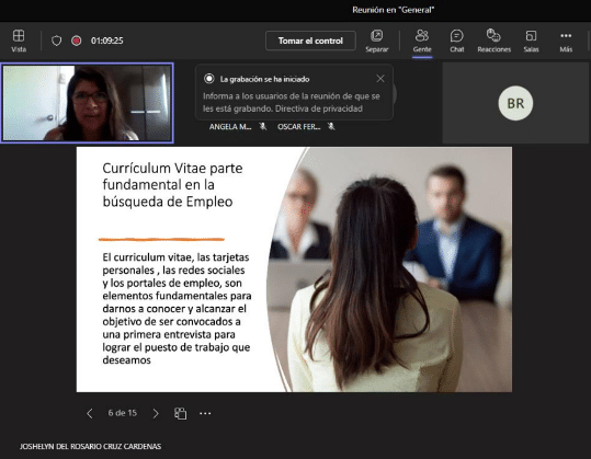 Una de las primeras charlas virtuales organizadas como parte de esta iniciativa fue titulada «Cómo elaborar un Curriculum Vitae». La sesión, que se llevó a cabo el 18 de enero, estuvo a cargo de la Licenciada en Psicología Glynnis Chávez Ojeda. Durante esta charla, se enfatizó la importancia de crear un currículum vitae efectivo que destaque las habilidades y experiencias de manera impactante para los empleadores.