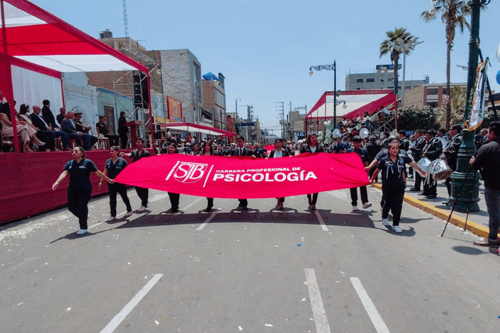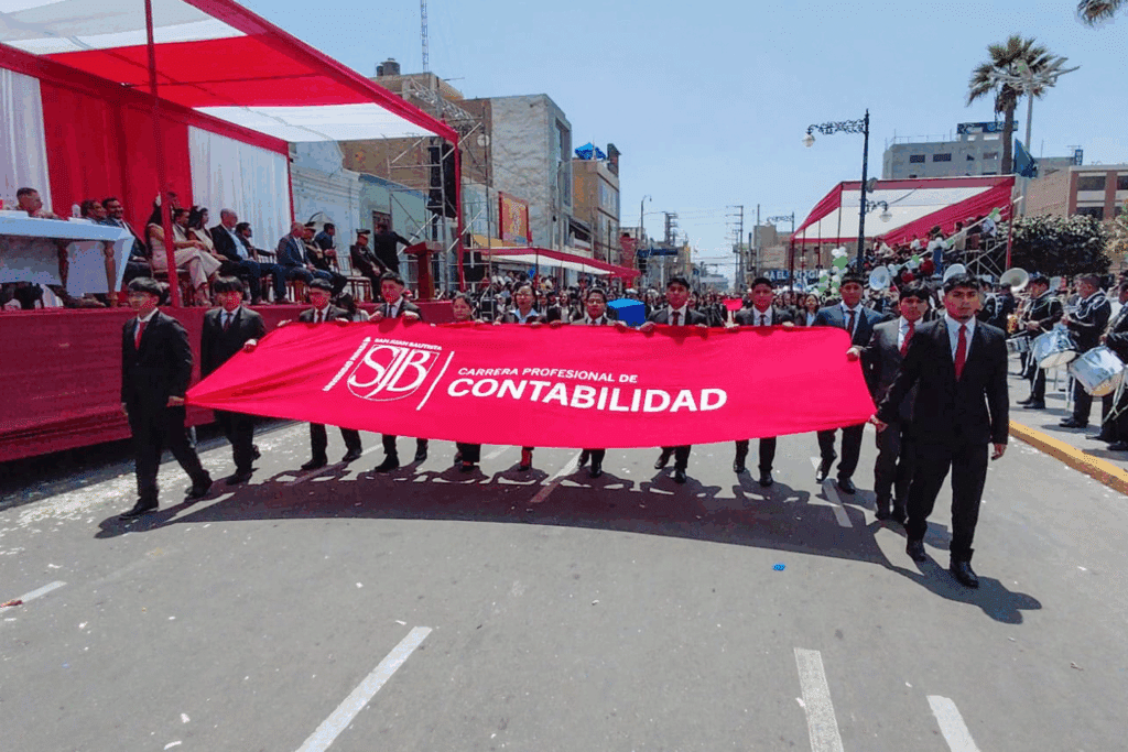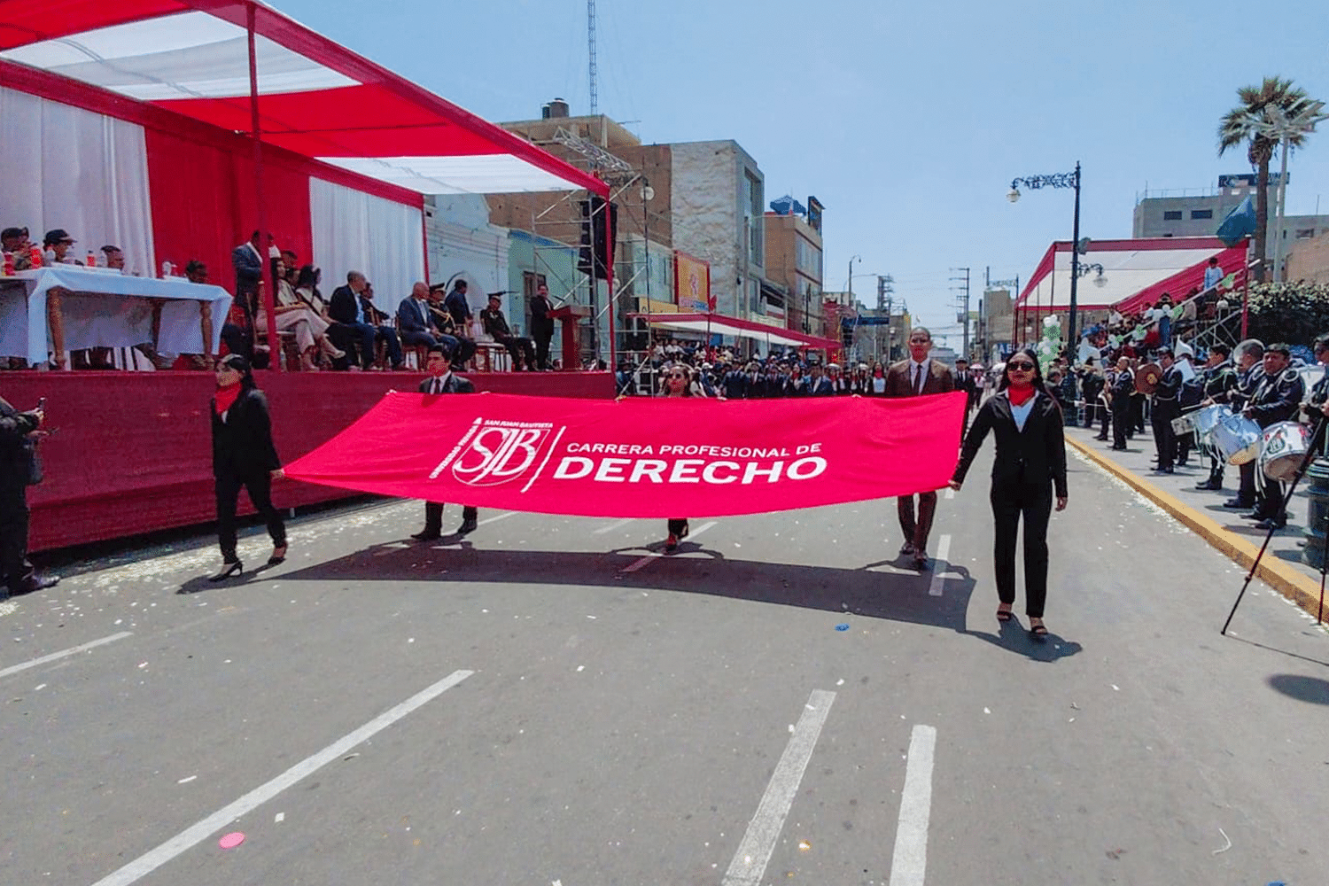 La Universidad Privada San Juan Bautista (UPSJB) tuvo una destacada participación, representando con orgullo a todas sus carreras profesionales, así como a su plana administrativa, docente y estudiantil, quienes desfilaron con marcialidad y compromiso institucional.