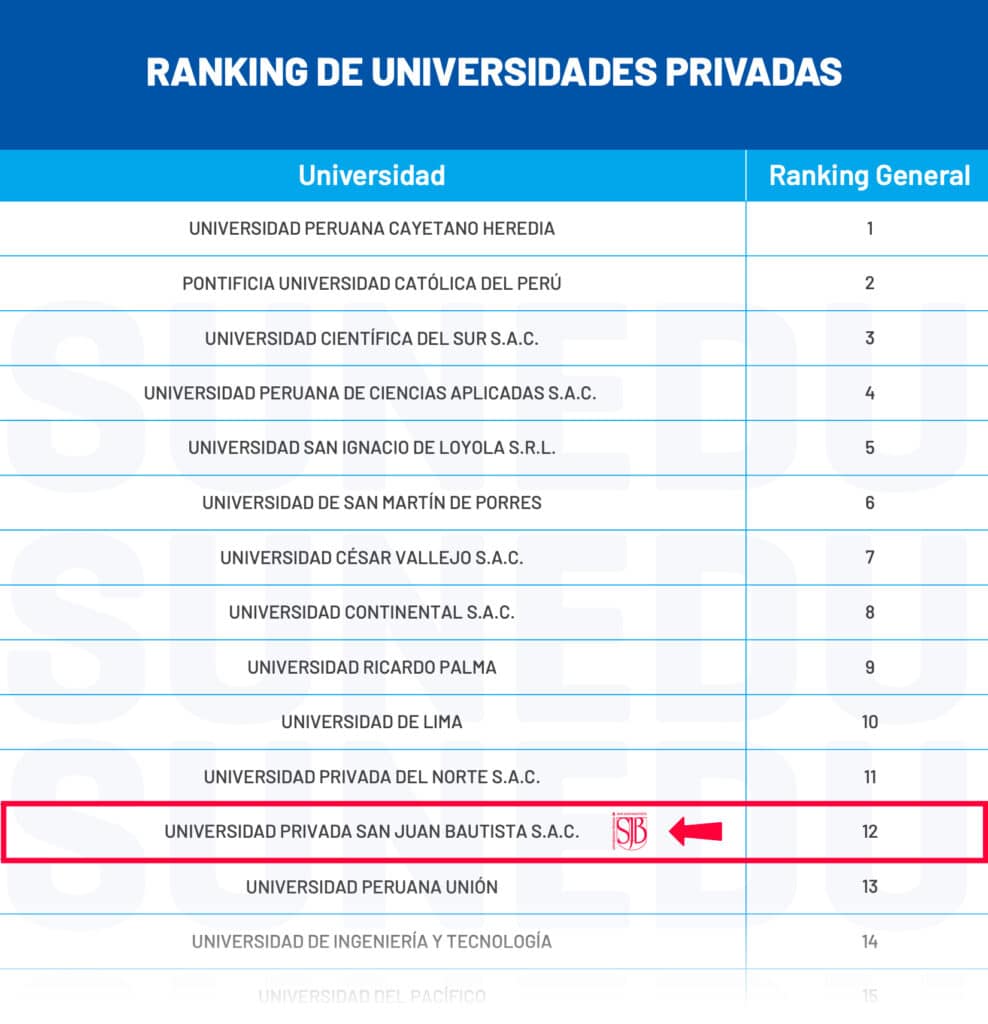 Inicio » Universidad Privada San Juan Bautista alcanza el puesto 12 en el ranking SUNEDU