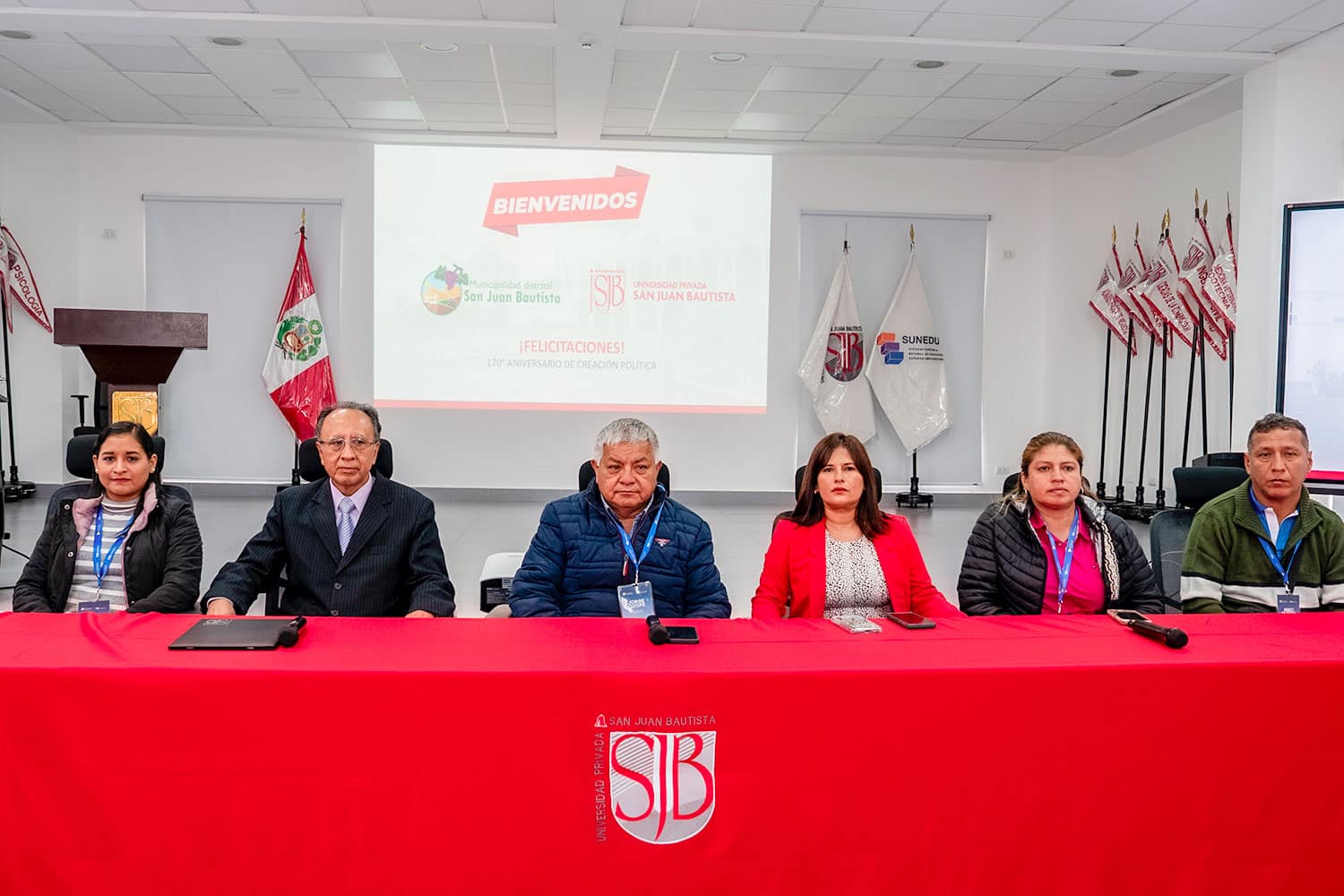 La Universidad Privada San Juan Bautista (UPSJB) recibió una importante visita institucional el pasado 12 de junio de 2025, en el marco de la celebración del 170.º Aniversario de creación política del distrito de San Juan Bautista (Ica). La delegación, encabezada por el Sr. Jorge Luis Quispe Saavedra, alcalde distrital, fue recibida en el Campus Chorrillos por nuestras autoridades académicas, destacando la presencia del Dr. Eddy Montañez Muñoz, rector de la UPSJB.